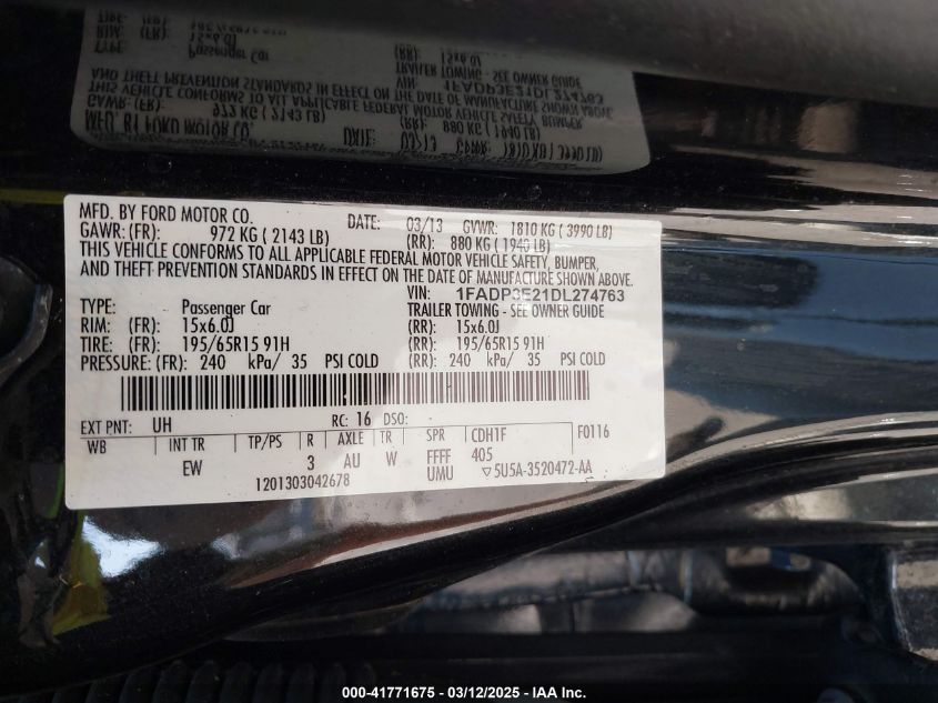 Color BlackCylinders 4Drive Front wheel driveVIN 1FADP3E21DL******State Run & Drive VerifiedDamage Rear rightAuction date 2025-03-20 AutoRIA