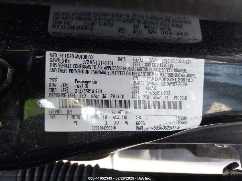 Color BlackCylinders 4Drive Front wheel driveVIN 1FADP3F27FL******State Run & Drive VerifiedDamage Insignificant AutoRIA