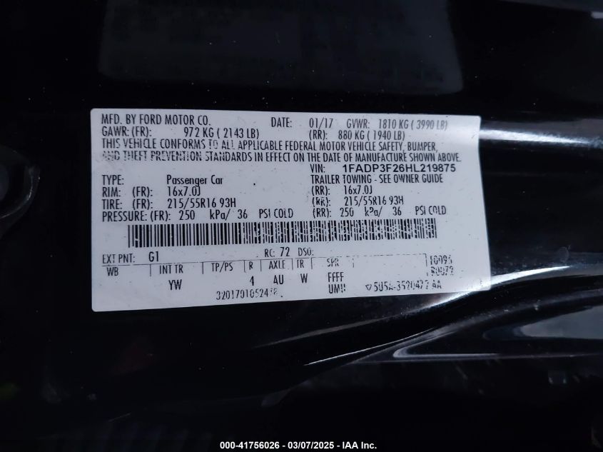 Color BlackCylinders 4Drive Front wheel driveVIN 1FADP3F26HL******State Run & Drive VerifiedDamage Front left AutoRIA