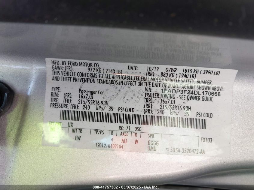 Color SilverCylinders 4Drive Front wheel driveVIN 1FADP3F24DL******State Run & Drive VerifiedDamage Front or back AutoRIA