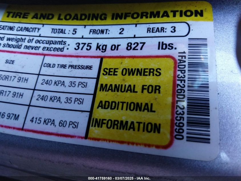 Color SilverCylinders 4Drive Front wheel driveVIN 1FADP3F26DL******State Run & Drive VerifiedDamage Front left AutoRIA