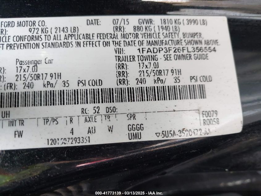 Color BlackCylinders 4Drive Front wheel driveVIN 1FADP3F26FL******State Run & Drive VerifiedDamage Right side AutoRIA