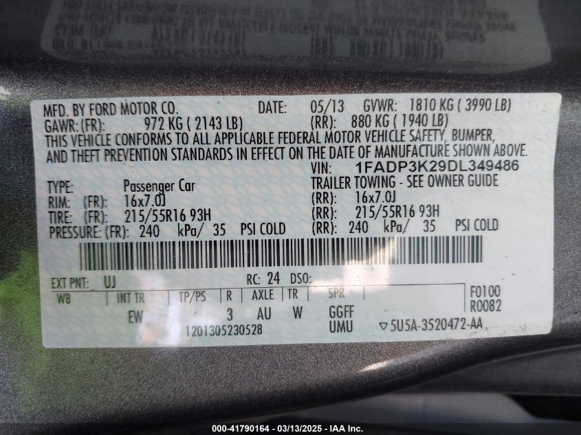 Color GrayCylinders 4Drive Front wheel driveVIN 1FADP3K29DL******State Run & Drive VerifiedDamage Right side AutoRIA
