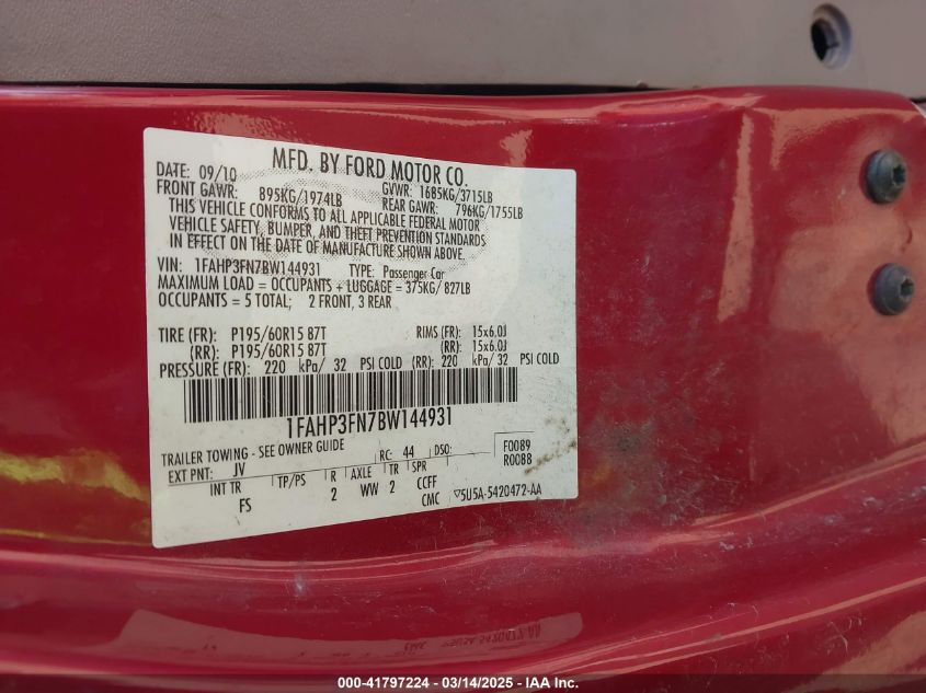 Color RedCylinders 4Drive Front wheel driveVIN 1FAHP3FN7BW******State Run & Drive VerifiedDamage Front or back AutoRIA