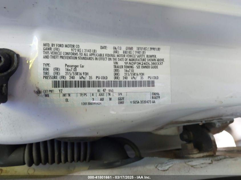 Color WhiteCylinders 4Drive Front wheel driveVIN 1FADP3K24DL******State Run & Drive VerifiedDamage Front or back AutoRIA