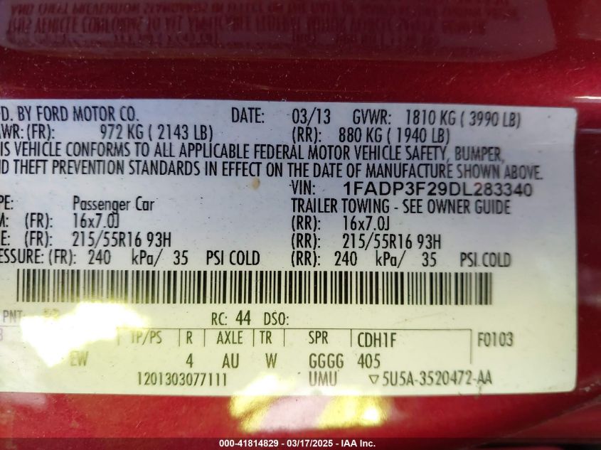 Color RedCylinders 4Drive Front wheel driveVIN 1FADP3F29DL******State Run & Drive VerifiedDamage Front or back AutoRIA