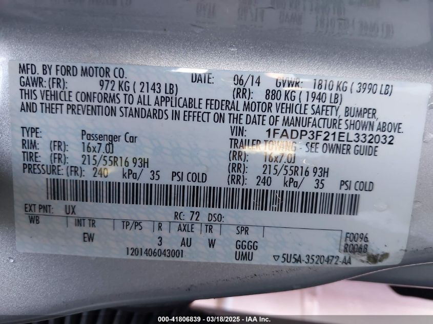 Color SilverCylinders 4Drive Front wheel driveVIN 1FADP3F21EL******State Run & Drive VerifiedDamage Back AutoRIA