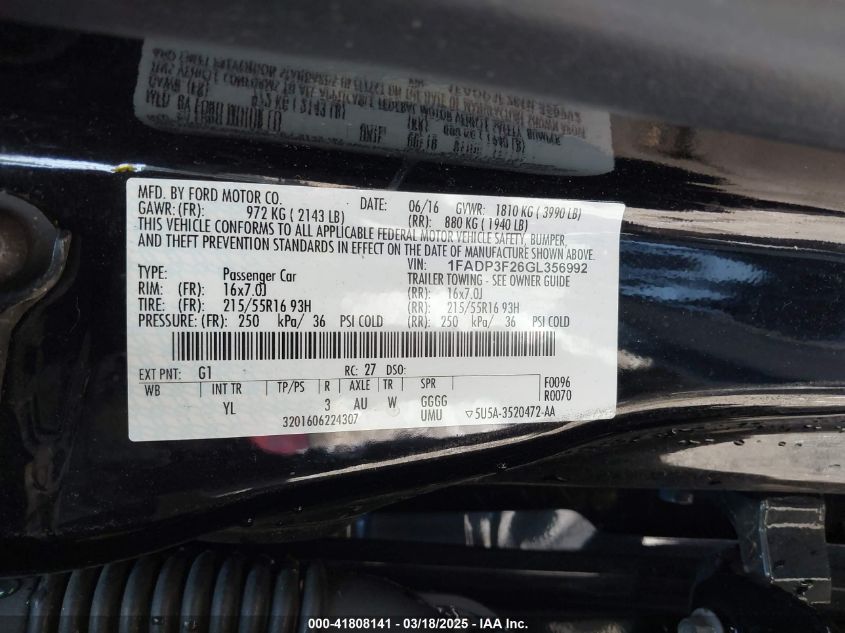 Color BlackCylinders 4Drive Front wheel driveVIN 1FADP3F26GL******State Run & Drive VerifiedDamage Front or back AutoRIA
