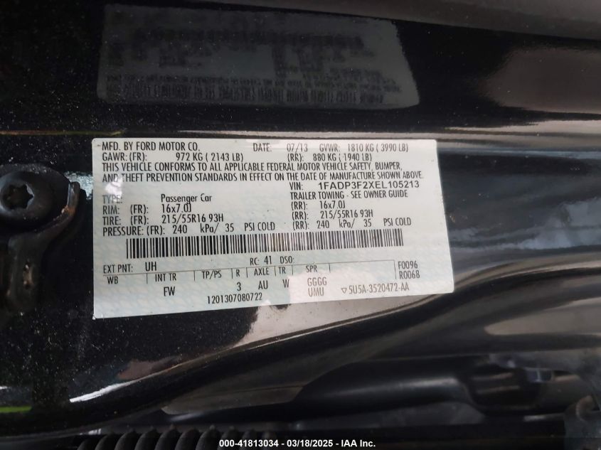 Color BlackCylinders 4Drive Front wheel driveVIN 1FADP3F2XEL******State Run & Drive VerifiedDamage Front left AutoRIA