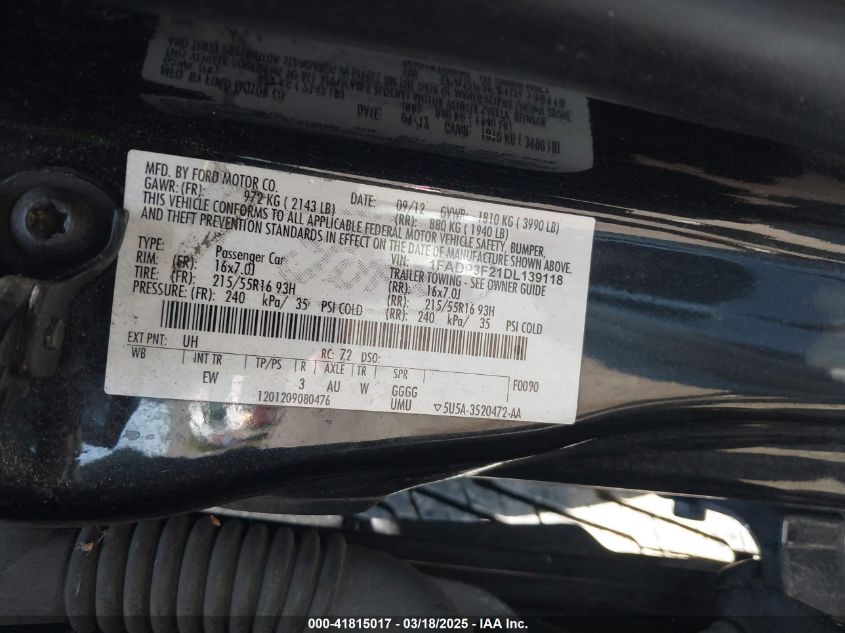 Color BlackCylinders 4Drive Front wheel driveVIN 1FADP3F21DL******State Run & Drive VerifiedDamage Front or back AutoRIA