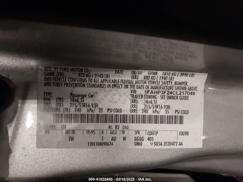 Color SilverCylinders 4Drive Front wheel driveVIN 1FAHP3F24CL******State Run & Drive VerifiedDamage Front or back AutoRIA