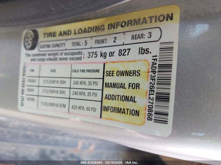 Color SilverCylinders 4Drive Front wheel driveVIN 1FADP3F26EL******State Run & Drive VerifiedDamage Front or back AutoRIA