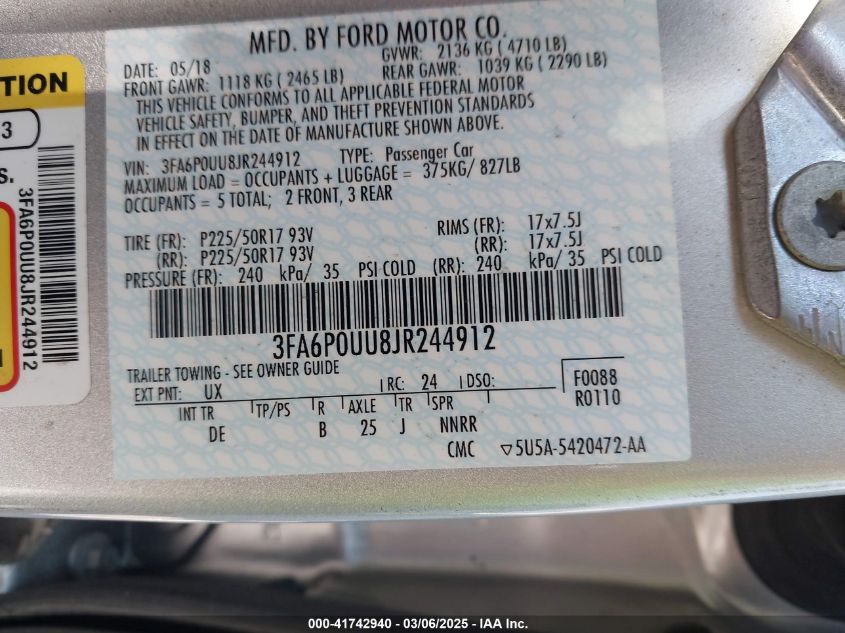 Color SilverCylinders 4Drive Front wheel driveVIN 3FA6P0UU8JR******State Run & Drive VerifiedDamage Front and backAuction date 2025-03-25 AutoRIA