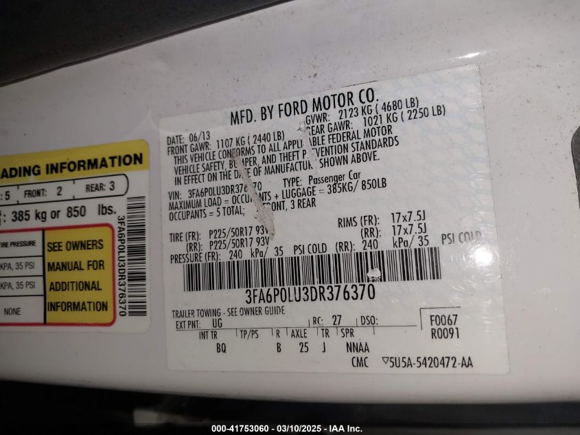 Color WhiteCylinders 4Drive Front wheel driveVIN 3FA6P0LU3DR******State Run & Drive VerifiedDamage Front or backAuction date 2025-03-20 AutoRIA