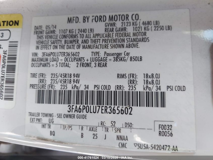 Color ChampagneCylinders 4Drive Front wheel driveVIN 3FA6P0LU7ER******State Run & Drive VerifiedDamage Front or backAuction date 2025-03-24 AutoRIA