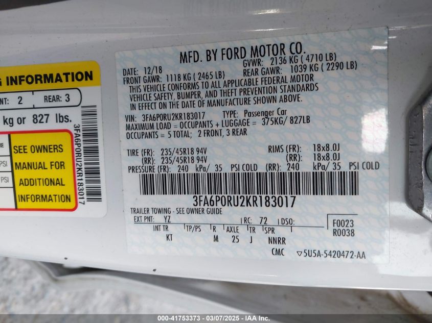 Color WhiteCylinders 4Drive Front wheel driveVIN 3FA6P0RU2KR******State Run & Drive VerifiedDamage BackAuction date 2025-03-26 AutoRIA