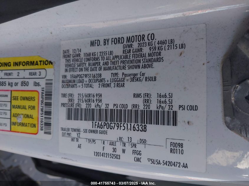 Color WhiteCylinders 4Drive Front wheel driveVIN 1FA6P0G79F5******State Run & Drive VerifiedDamage InsignificantAuction date 2025-03-26 AutoRIA