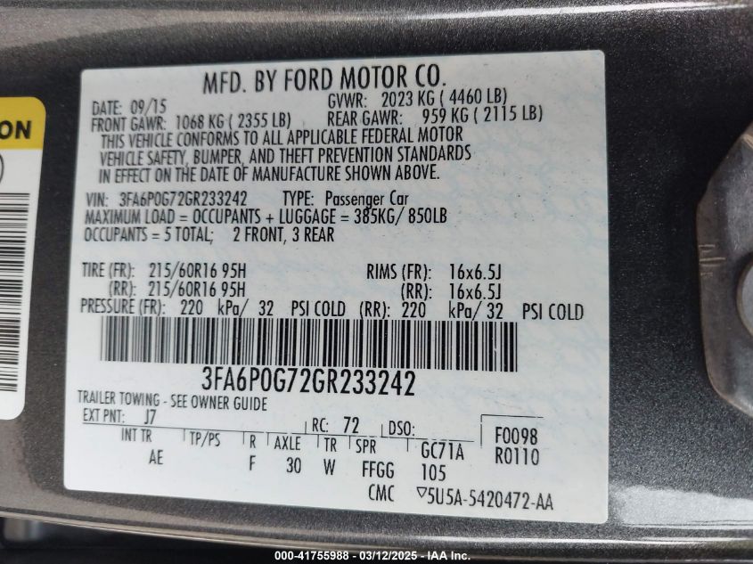 Color GrayCylinders 4Drive Front wheel driveVIN 3FA6P0G72GR******State Run & Drive VerifiedDamage Front rightAuction date 2025-03-26 AutoRIA