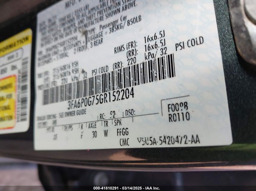 Color GreenCylinders 4Drive Front wheel driveVIN 3FA6P0G75GR******State Run & Drive VerifiedDamage Back AutoRIA