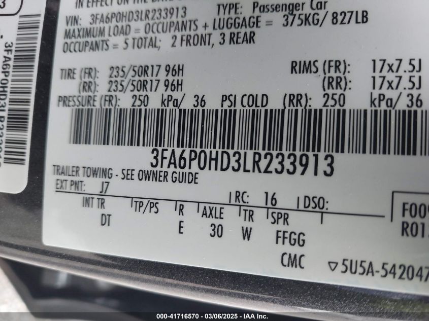 Color GrayCylinders 4Drive Front wheel driveVIN 3FA6P0HD3LR******State Run & Drive VerifiedDamage Front or back AutoRIA