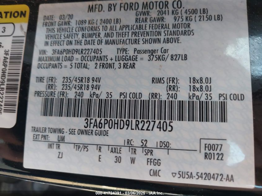 Color BlackCylinders 4Drive Front wheel driveVIN 3FA6P0HD9LR******State Run & Drive VerifiedDamage Front left AutoRIA