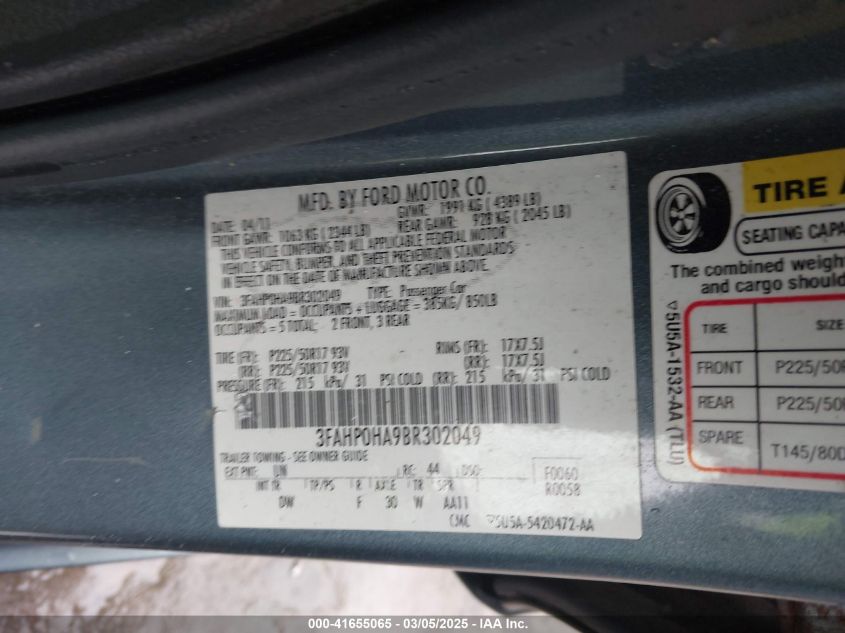 Color BlueCylinders 4Drive Front wheel driveVIN 3FAHP0HA9BR******State Run & Drive VerifiedDamage Left sideAuction date 2025-03-20 AutoRIA