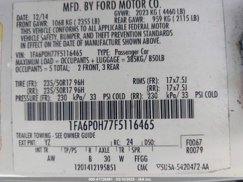 Color WhiteCylinders 4Drive Front wheel driveVIN 1FA6P0H77F5******State Run & Drive VerifiedDamage Front or back AutoRIA