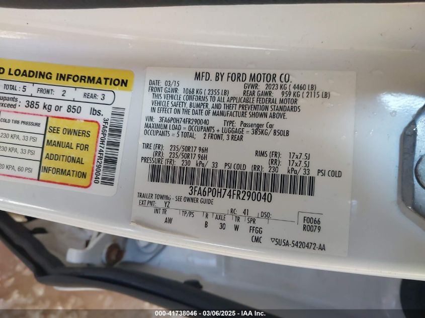 Color WhiteCylinders 4Drive Front wheel driveVIN 3FA6P0H74FR******State Run & Drive VerifiedDamage Left side AutoRIA