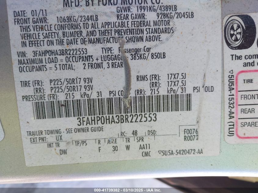Color SilverCylinders 4Drive Front wheel driveVIN 3FAHP0HA3BR******State Run & Drive VerifiedDamage Rear right AutoRIA