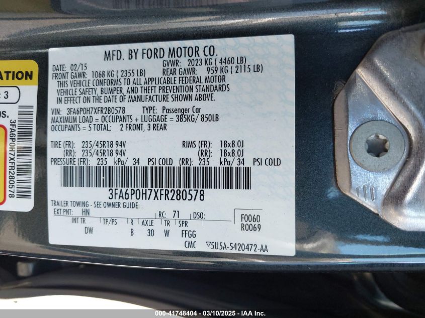 2015 FORD FUSION 2015 Gasoline, 2.5, Front wheel drive, VIN - 3FA6P0H7XFR****** from the USA