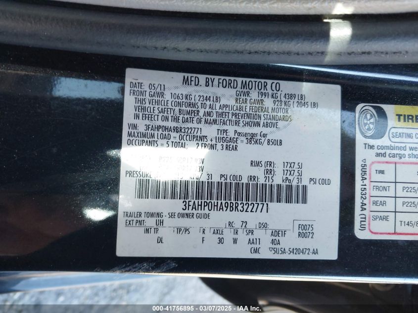 Color BlackCylinders 4Drive Front wheel driveVIN 3FAHP0HA9BR******State Run & Drive VerifiedDamage Front or back AutoRIA