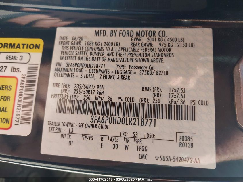 2020 FORD FUSION 2020 Gasoline, 1.5, Front wheel drive, VIN - 3FA6P0HD0LR****** from the USA
