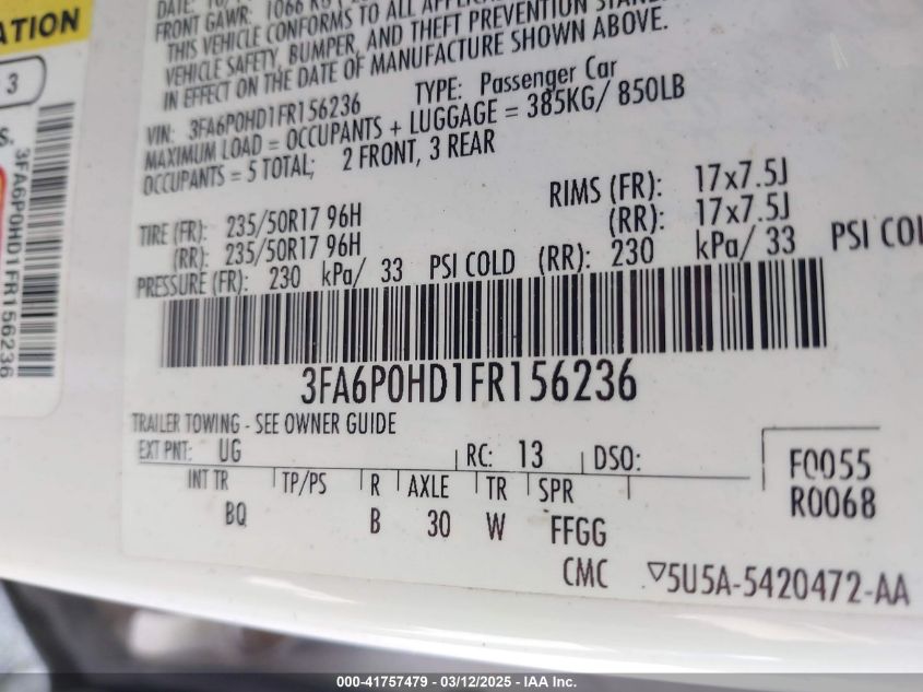 Color WhiteCylinders 4Drive Front wheel driveVIN 3FA6P0HD1FR******State Run & Drive VerifiedDamage Motor AutoRIA