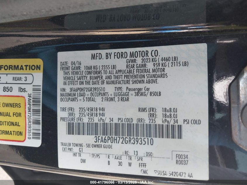 Color BlackCylinders 4Drive Front wheel driveVIN 3FA6P0H72GR******State Run & Drive VerifiedDamage Front or back AutoRIA