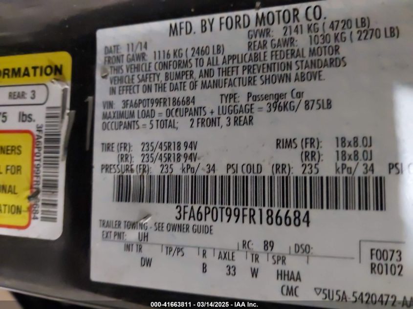2015 FORD FUSION 2015 Gasoline, 2.0, Full drive, VIN - 3FA6P0T99FR****** from the USA