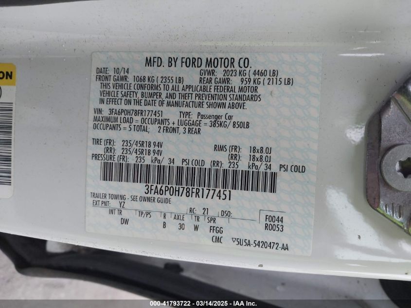 2015 FORD FUSION 2015 Gasoline, 2.5, Front wheel drive, VIN - 3FA6P0H78FR****** from the USA