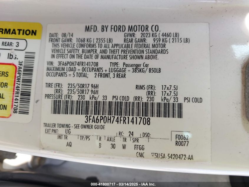 Color WhiteCylinders 4Drive Front wheel driveVIN 3FA6P0H74FR******State Run & Drive VerifiedDamage Front or back AutoRIA