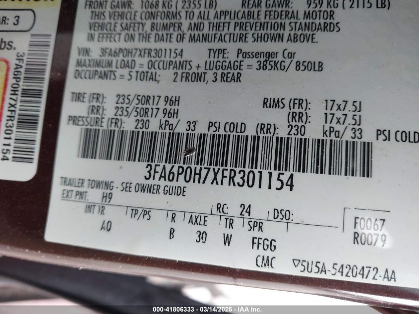 Color BrownCylinders 4Drive Front wheel driveVIN 3FA6P0H7XFR******State Run & Drive VerifiedDamage Left side AutoRIA