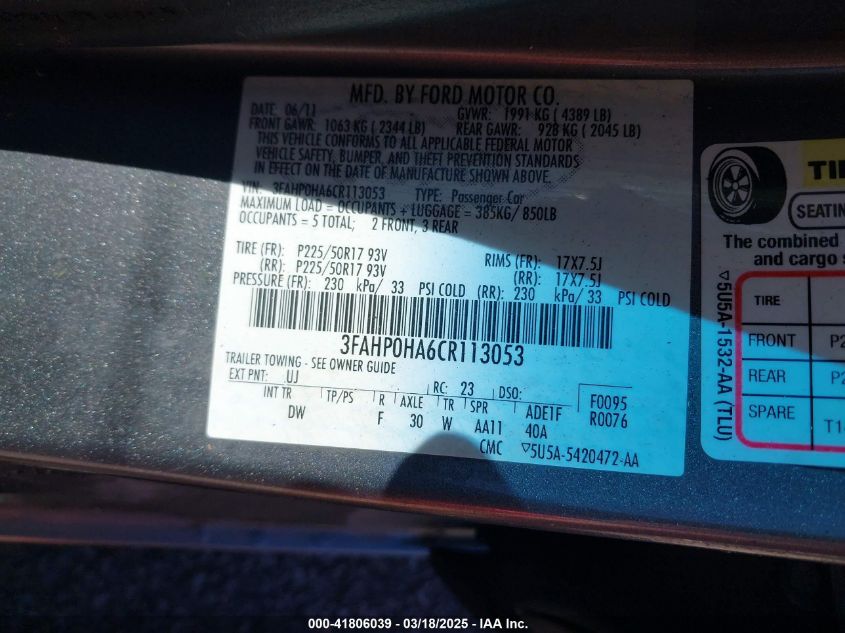 Color GrayCylinders 4Drive Front wheel driveVIN 3FAHP0HA6CR******State Run & Drive VerifiedDamage Front and back AutoRIA