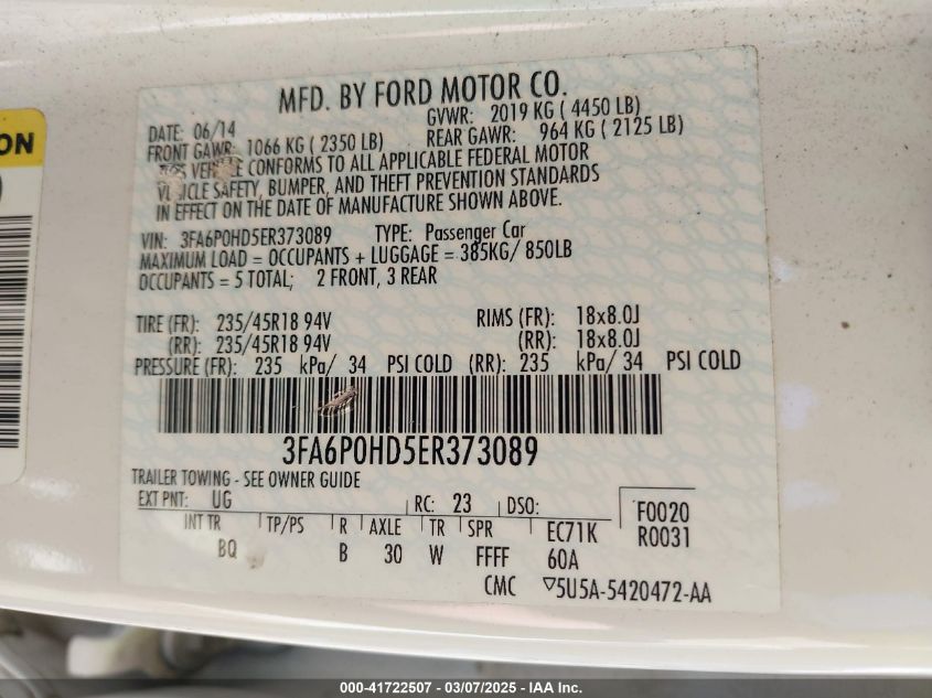 Color WhiteCylinders 4Drive Front wheel driveVIN 3FA6P0HD5ER******State Run & Drive VerifiedDamage Right sideAuction date 2025-03-20 AutoRIA