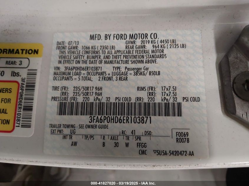 Color WhiteCylinders 4Drive Front wheel driveVIN 3FA6P0HD6ER******State Run & Drive VerifiedDamage Front left AutoRIA