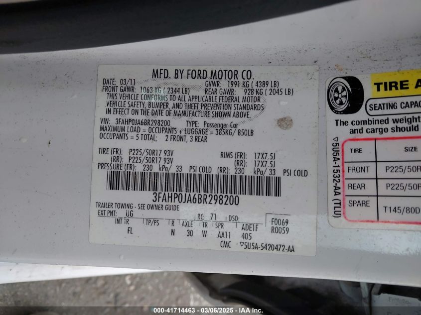 Color WhiteCylinders 4Drive Front wheel driveVIN 3FAHP0JA6BR******State Run & Drive VerifiedDamage Front or back AutoRIA