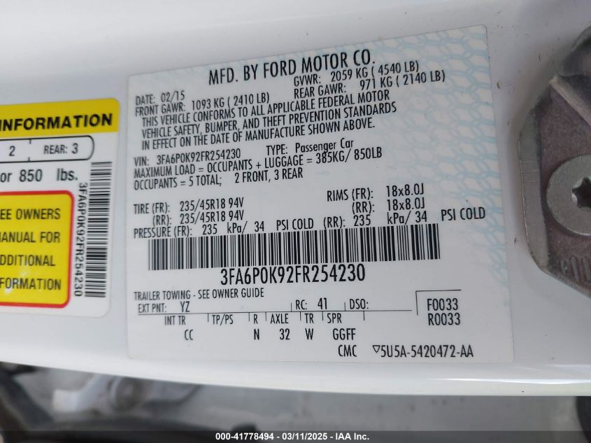 2015 FORD FUSION 2015 Gasoline, 2.0, Front wheel drive, VIN - 3FA6P0K92FR****** from the USA