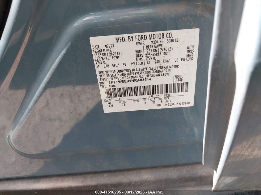 Color BlueCylinders 4Drive Front wheel driveVIN 3FTTW8E91NR******State Run & Drive VerifiedDamage Front and backAuction date 2025-03-26 AutoRIA