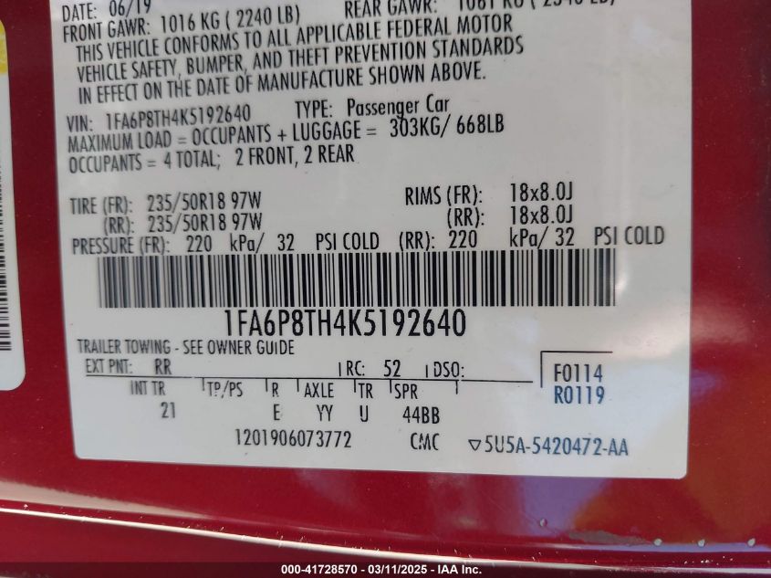 Color RedCylinders 4Drive Rear wheel driveVIN 1FA6P8TH4K5******State Run & Drive VerifiedDamage Front or back AutoRIA