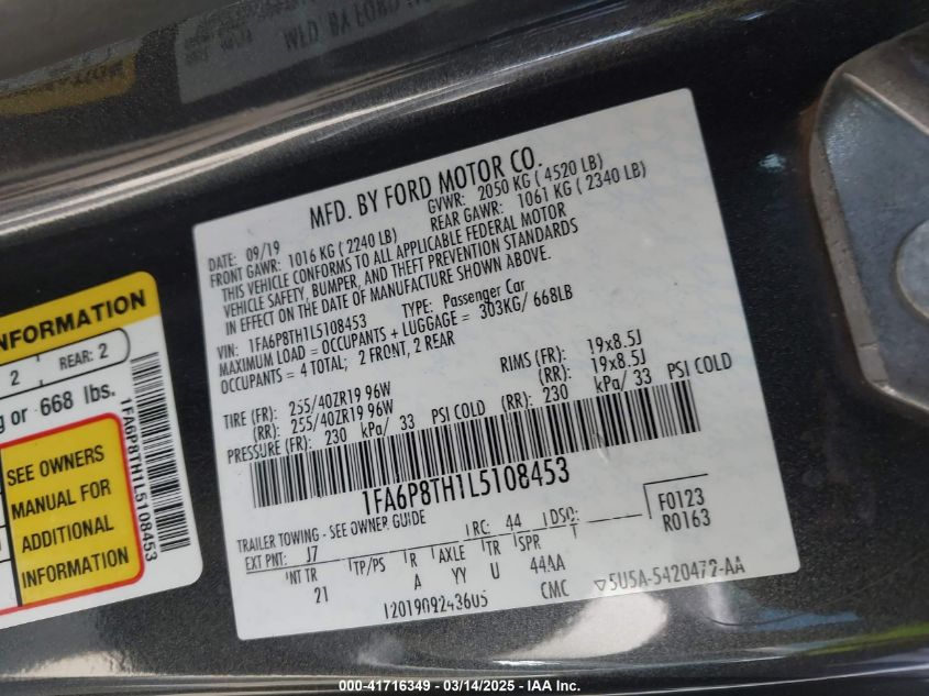 2020 FORD MUSTANG 2020 Gasoline, 2.3, Rear wheel drive, VIN - 1FA6P8TH1L5****** from the USA