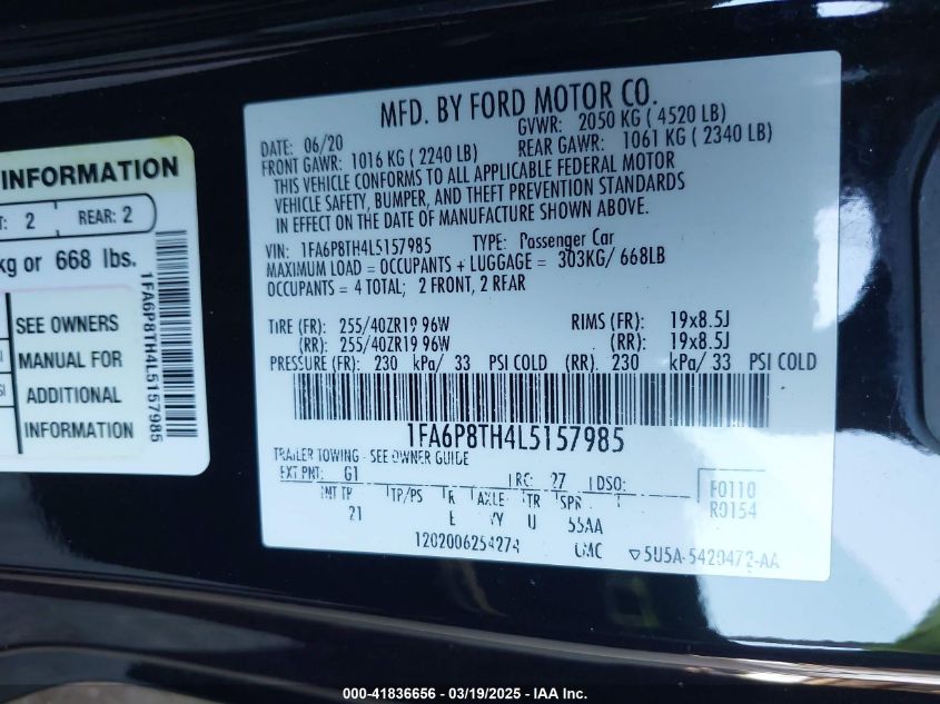 2020 FORD MUSTANG 2020 Gasoline, 2.3, Rear wheel drive, VIN - 1FA6P8TH4L5****** from the USA
