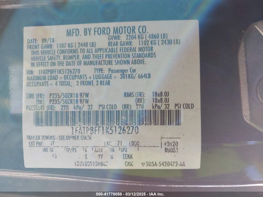 2019 FORD MUSTANG 2019 Gasoline, 5.0, Rear wheel drive, VIN - 1FATP8FF1K5****** from the USA