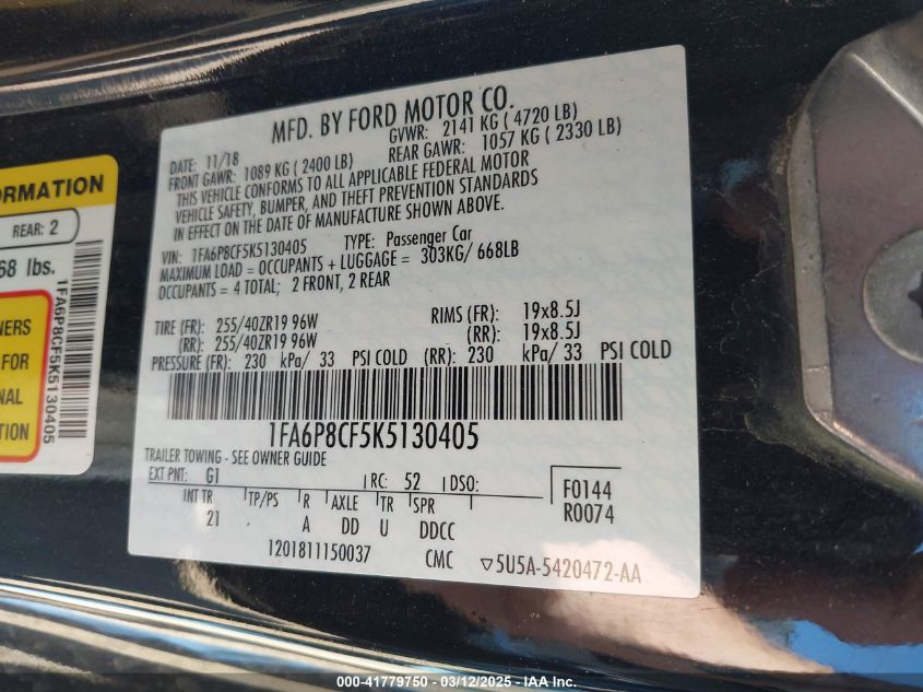 2019 FORD MUSTANG 2019 Gasoline, 5.0, Rear wheel drive, VIN - 1FA6P8CF5K5****** from the USA