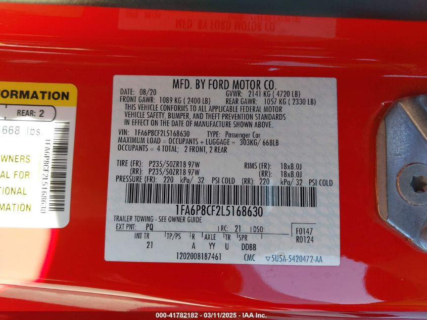 2020 FORD MUSTANG 2020 Gasoline, 5.0, Rear wheel drive, VIN - 1FA6P8CF2L5****** from the USA